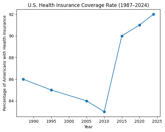 Figure 1: U.S. Health Insurance Coverage Rate (1987–2024). Coverage has significantly increased after the implementation of major healthcare reforms and currently exceeds 90 percent of the population.