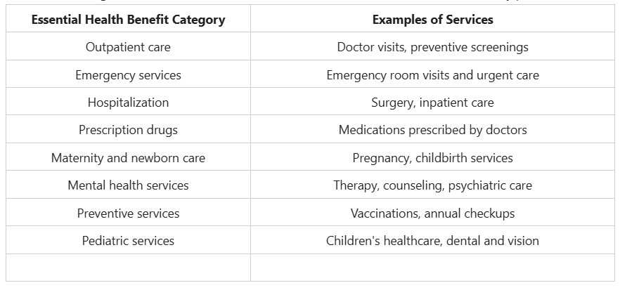 Essential health benefits are categories of healthcare services that most insurance plans must cover, including emergency care, hospitalization, prescription drugs, maternity care, and preventive services.